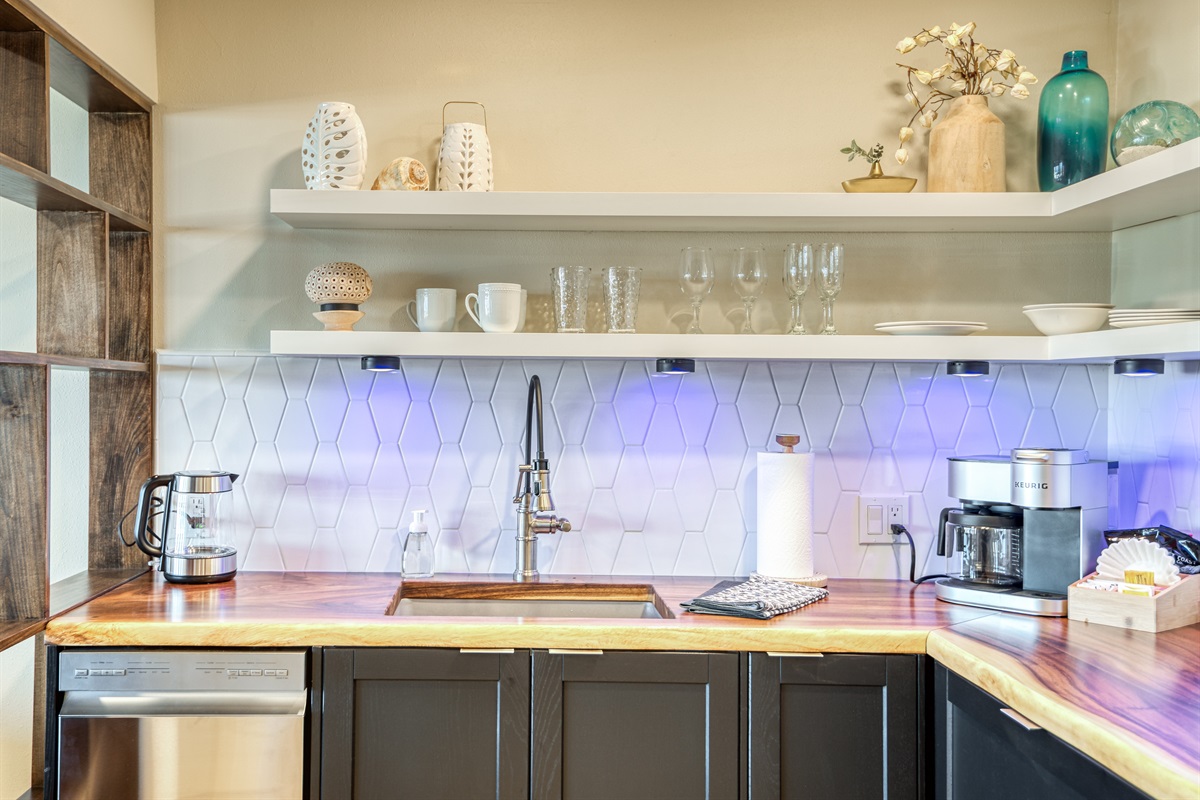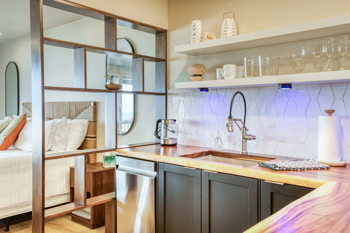 While this is not a full kitchen for cooking, it’s perfect for simple, no-fuss meals and snacks between your coastal adventures. You’ll have: