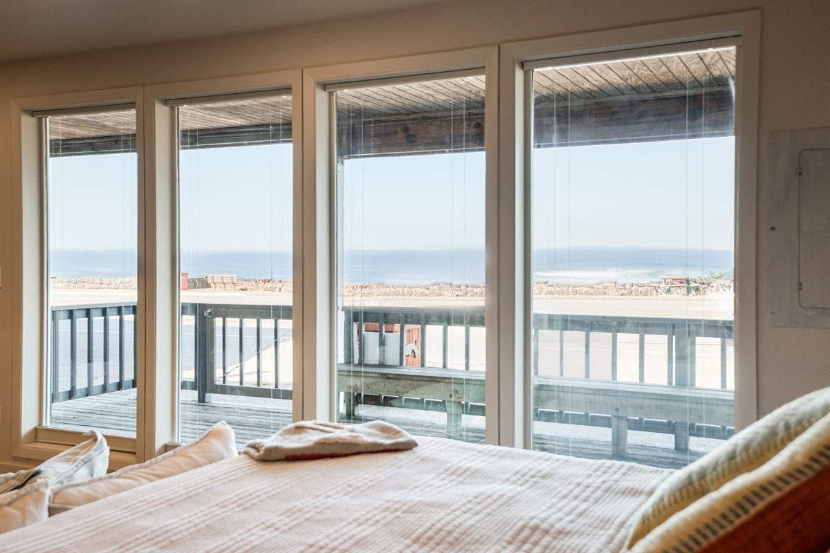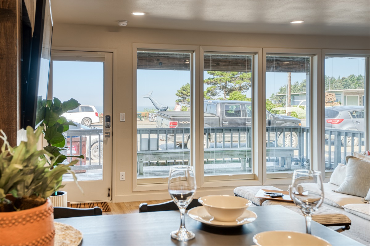 After finding your parking spot—either in the private lot behind the building (with a full flight of stairs down to the unit) or in public parking right outside with just one step into your door—you’re home. The moment you step inside, natural light greets you through an expansive wall of windows (each window has top to bottom, bottom to top blinds so you can let in as much light or enjoy as much of the view as you like), instantly connecting you to the sights and sounds of Depoe Bay.
