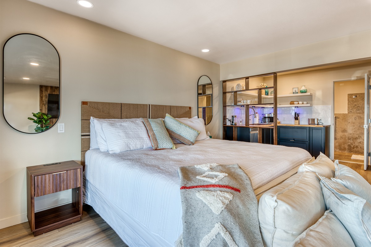 Bay Suites – Studio A blends sleek, contemporary finishes with a warm, welcoming layout. It’s designed to feel airy, fresh, and comfortable—equally suited for a short weekend getaway or a month-long coastal escape.