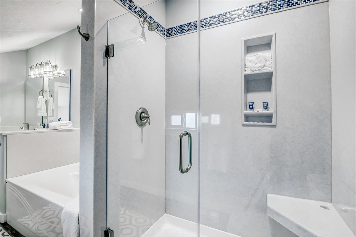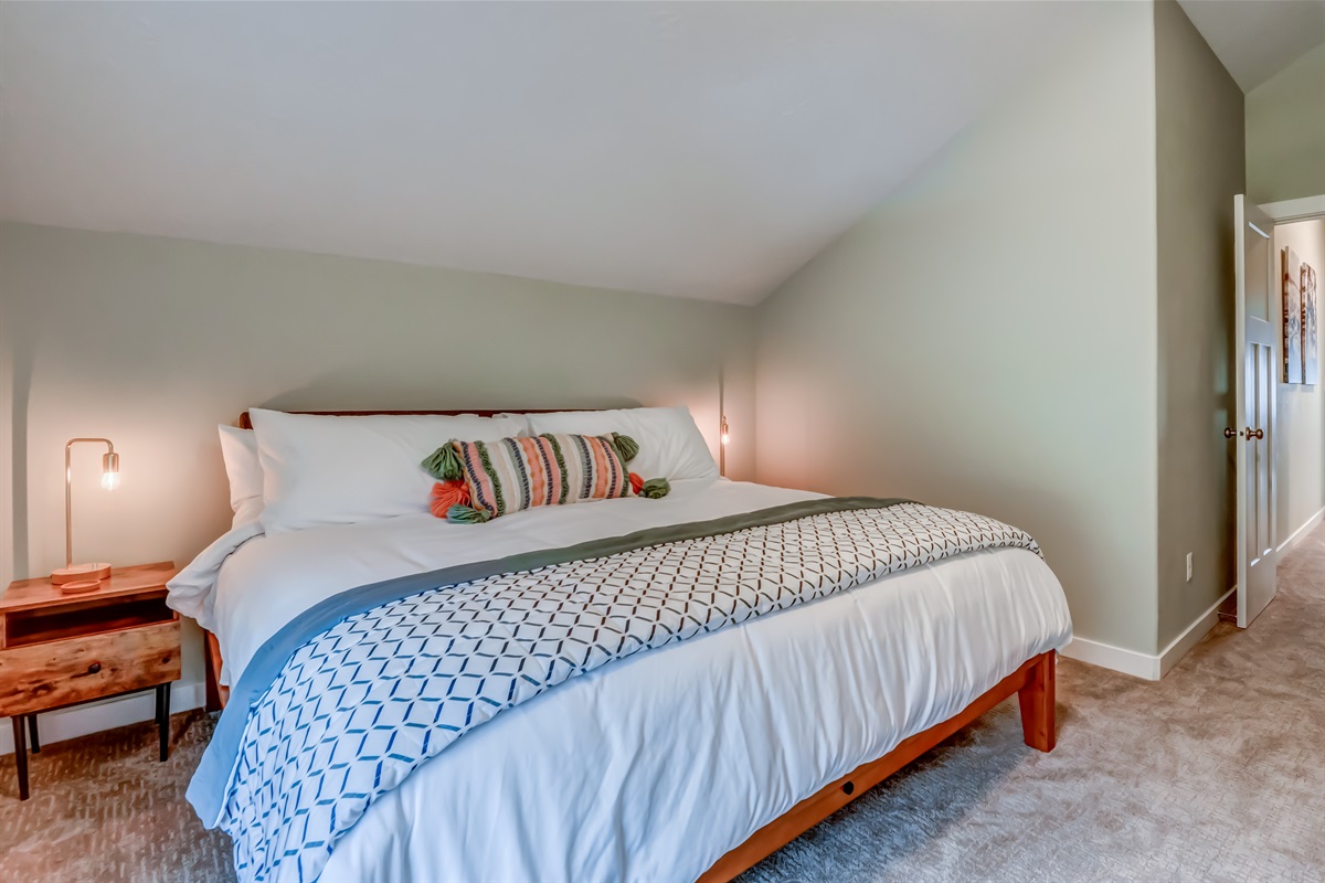 Main King Suite: Spacious and serene with a king-size bed, soaking tub, walk-in shower, and private bath.