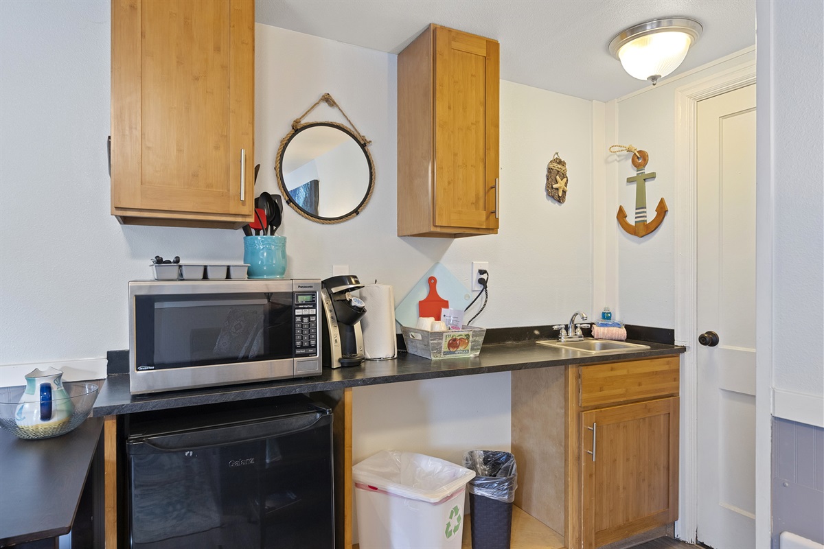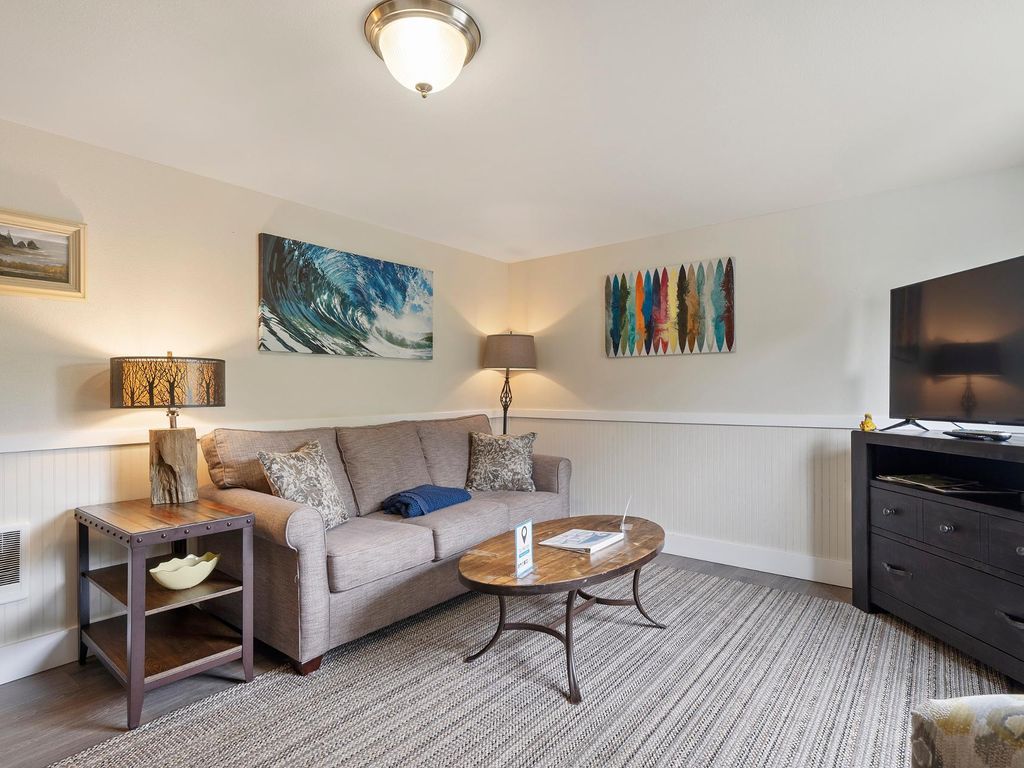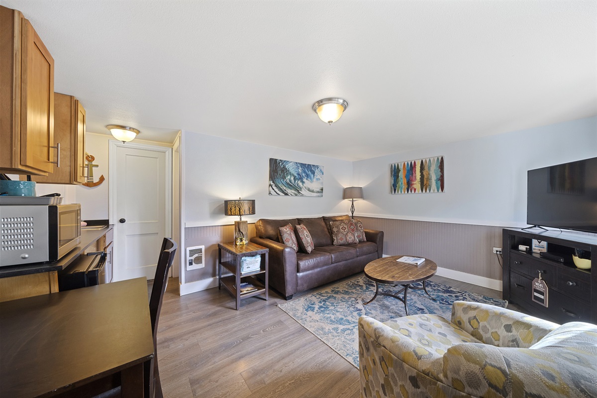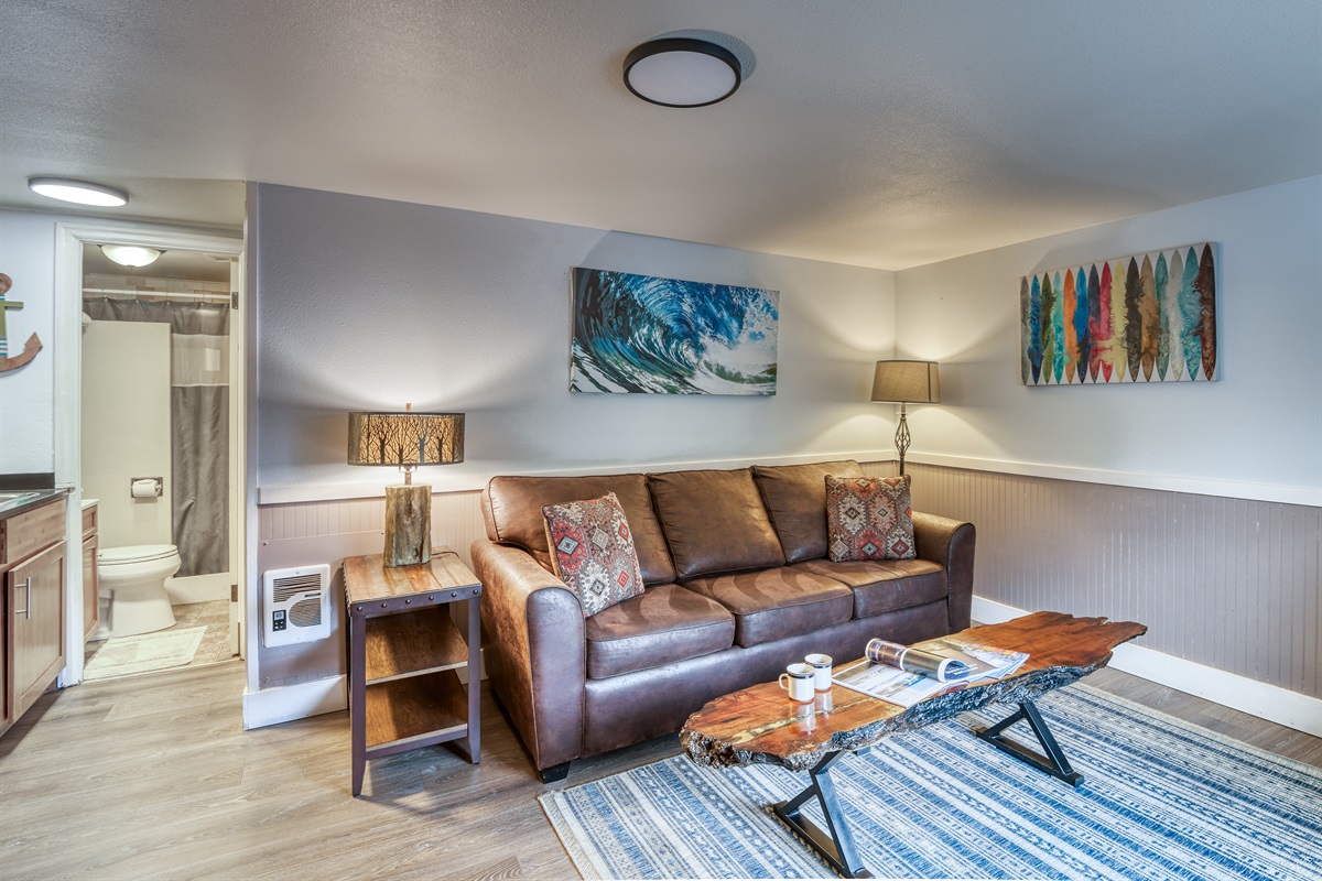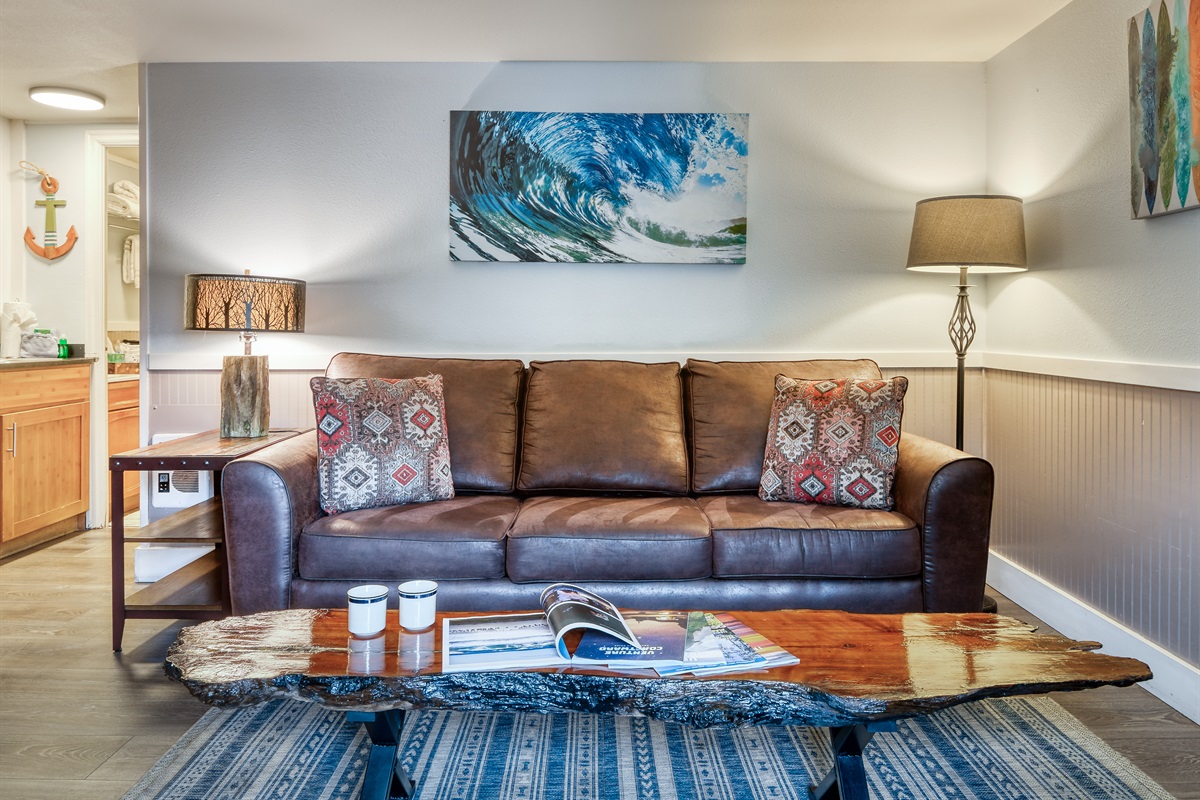 The Hang Ten (Unit #6) is a 1 bedroom unit with a kitchenette (no cooktop/oven). It features a spacious living space and a bedroom with a queen size bed. If you need to accommodate additional people the sofa is also a sleeper for 2 additional sleeping spaces. The unit will sleep 4. Please note the bedroom does not have a door.