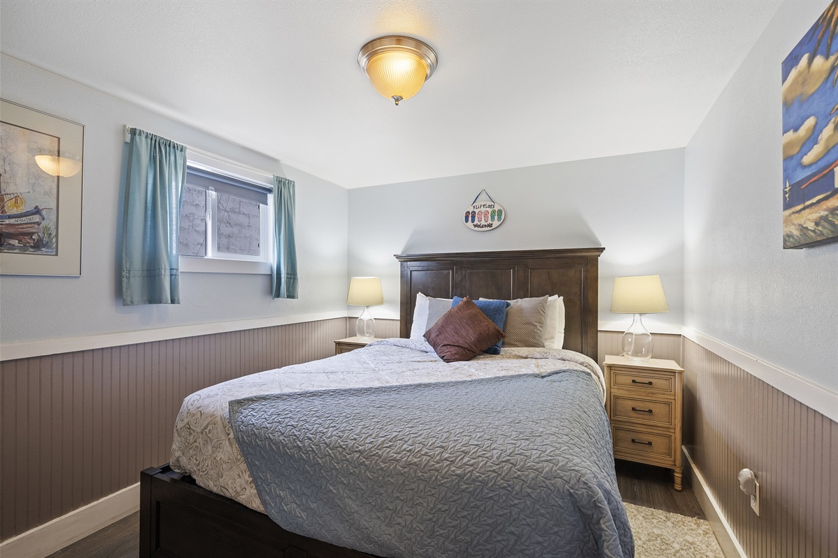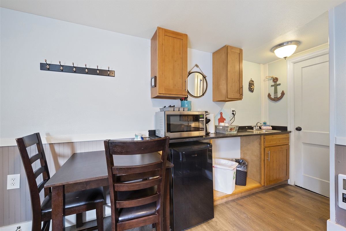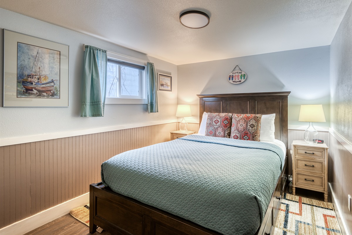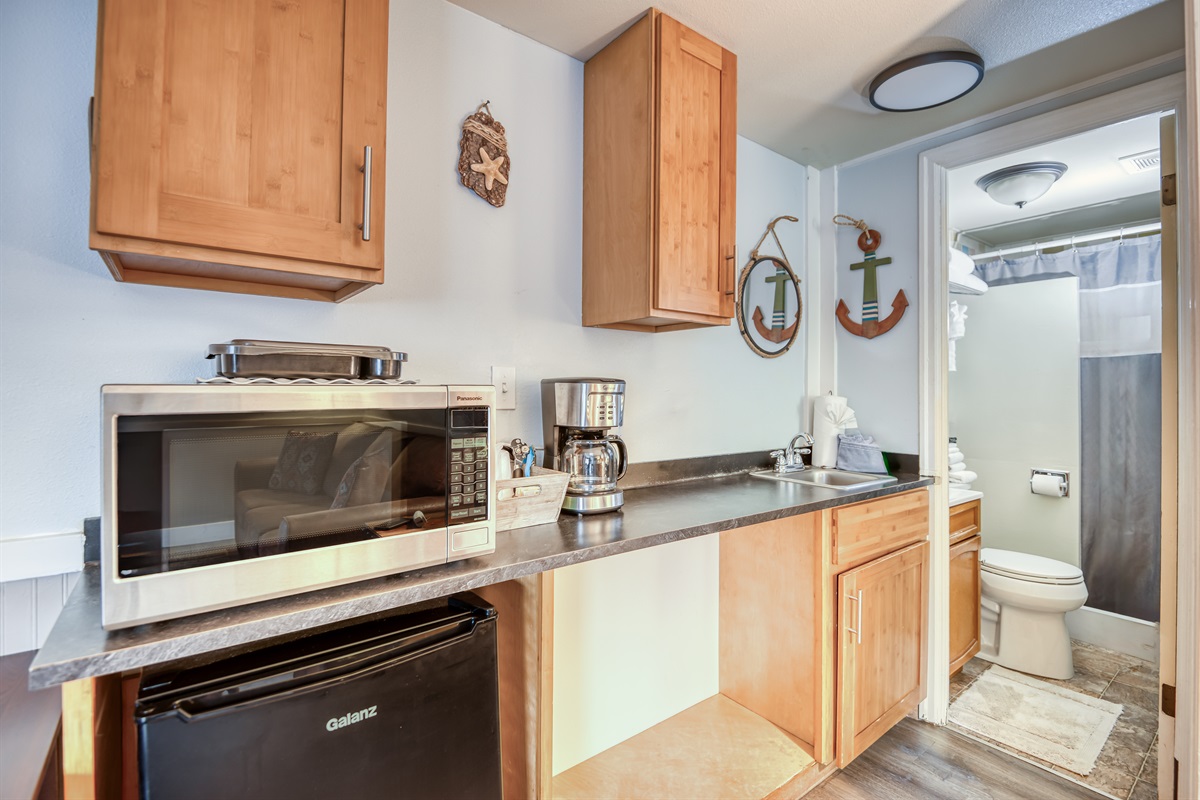The Hang Ten (Unit #6) is a 1 bedroom unit with a kitchenette (no cooktop/oven). It features a spacious living space and a bedroom with a queen size bed. If you need to accommodate additional people the sofa is also a sleeper for 2 additional sleeping spaces. The unit will sleep 4. Please note the bedroom does not have a door.