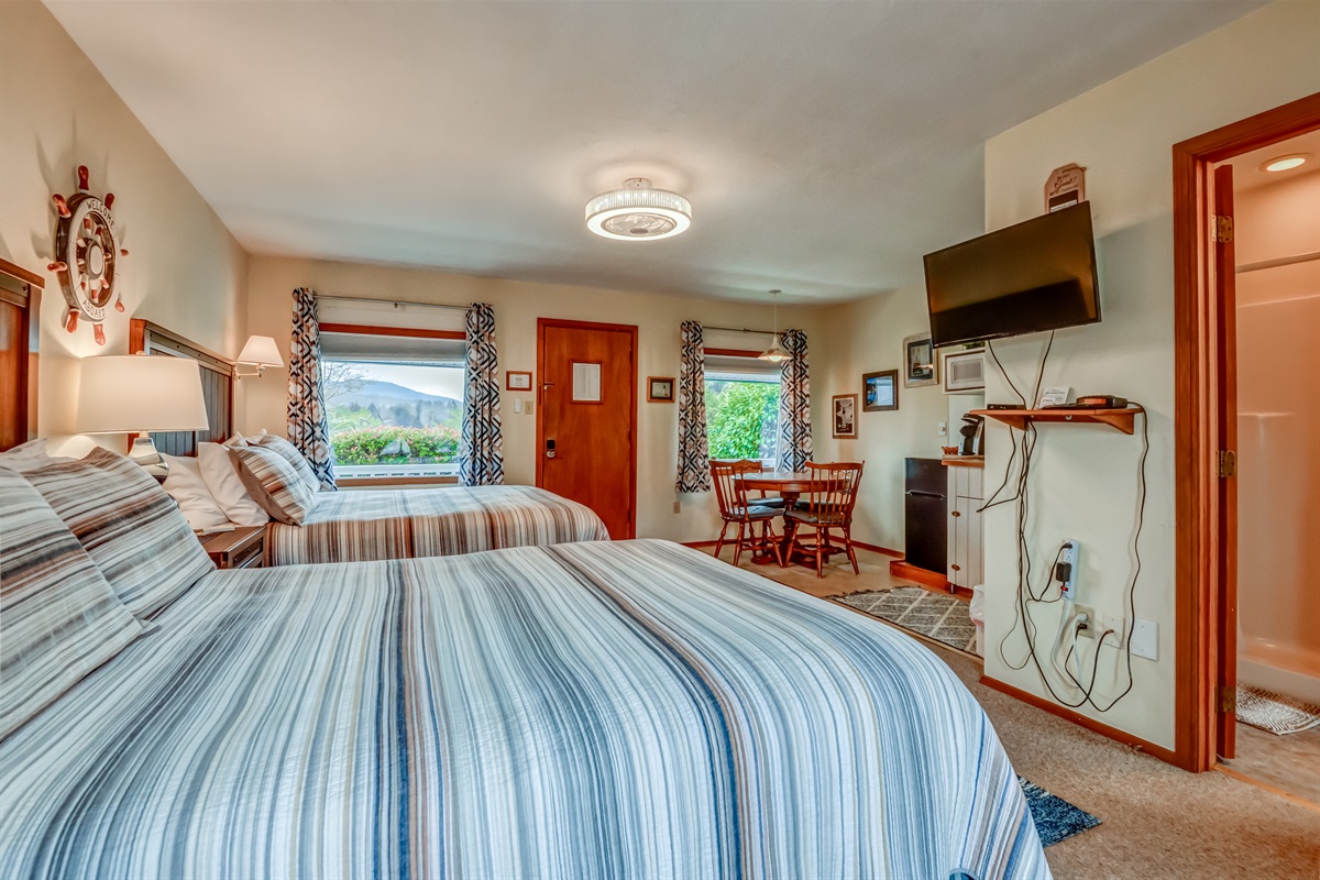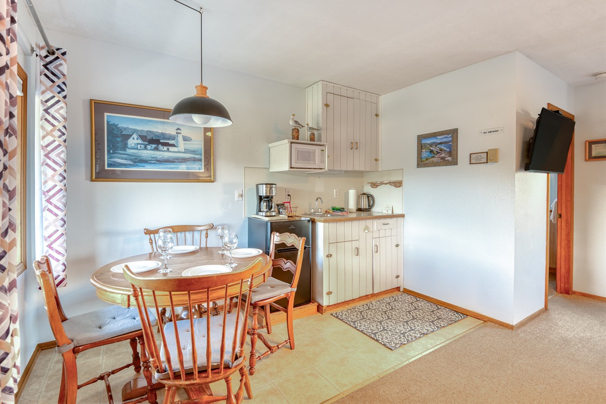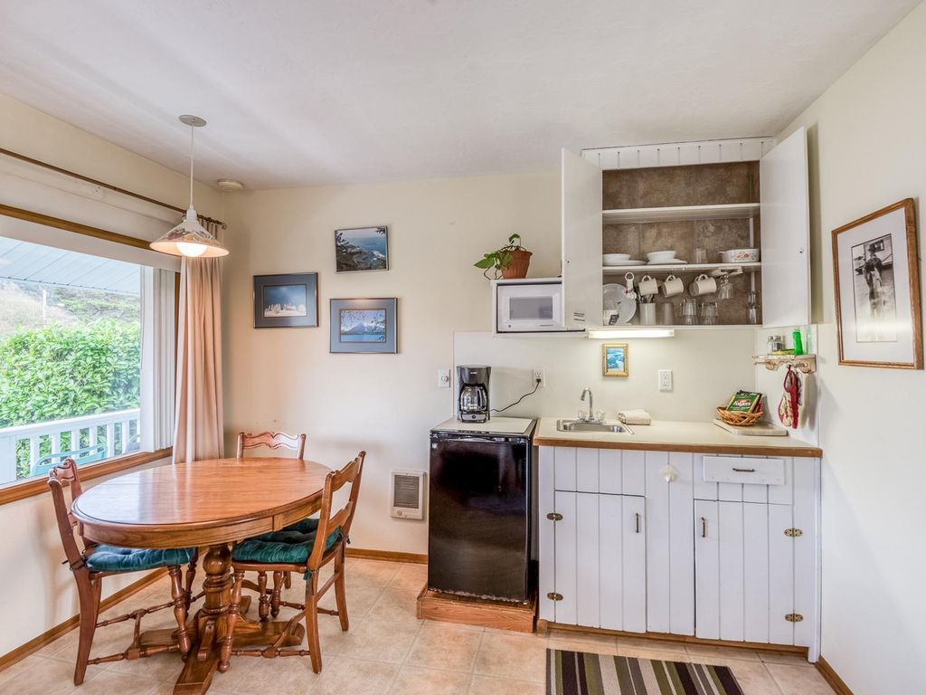 Experience the quiet beauty of Depoe Bay at this suite at Trollers Lodge! The Beacon is a studio unit with a kitchenette (no cooktop/oven) that has a microwave, mini refrigerator, Coffee maker and a toaster. The unit also has a flat screen TV with cable, and a small desk area for those that may need to bring along work.