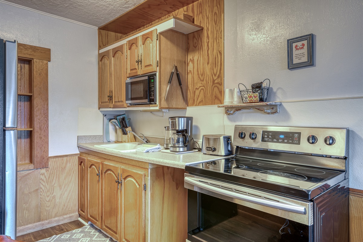 Decent sized room with oven, microwave, Keurig, and some basic cookware and utensils. Bedroom was fine. Shower stall was a little small, but it is nice that they supplied toothbrushes, lotions, shaving cream and razors. Good communication. No contact check in/out. Partial view of the ocean. Walking distance to most of the downtown shops and a short drive to Lincoln City and Newport. Recommended.