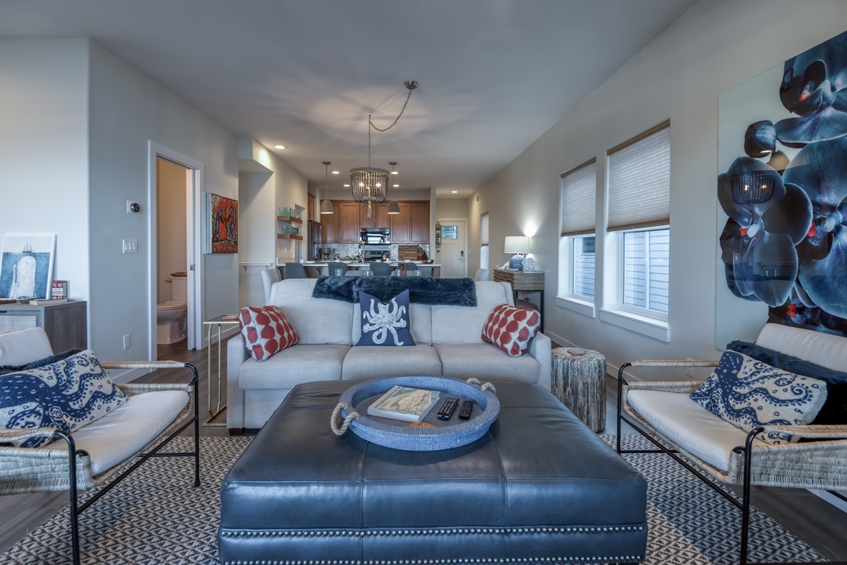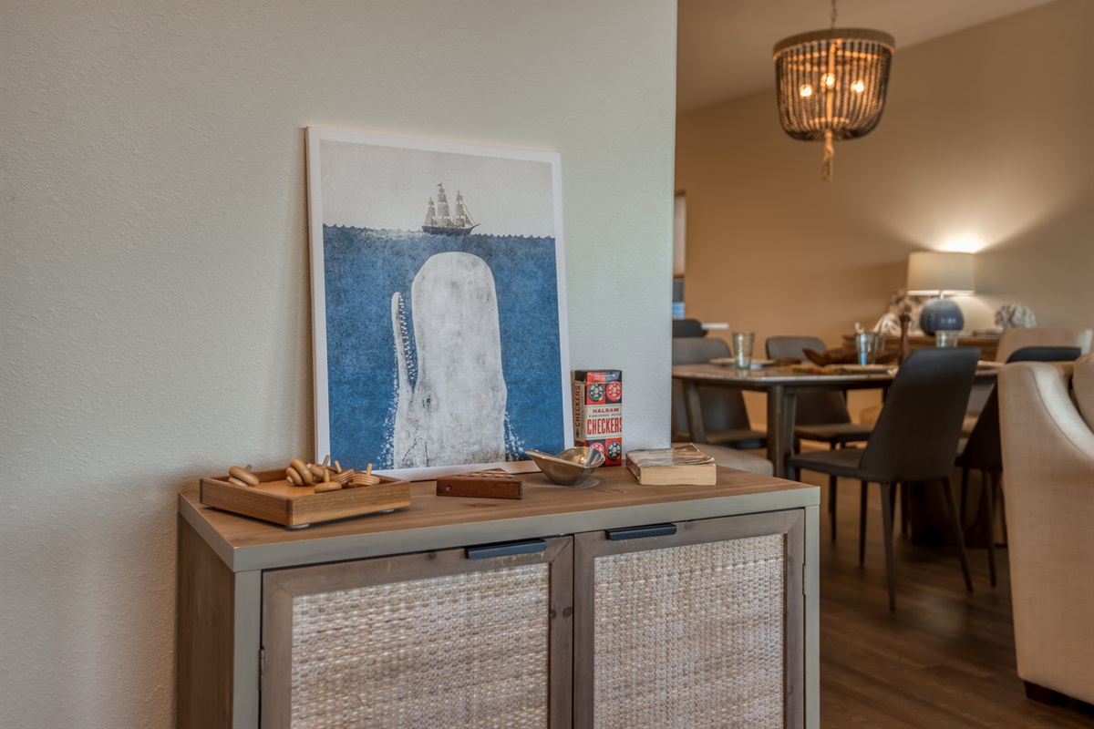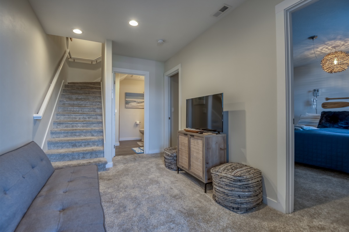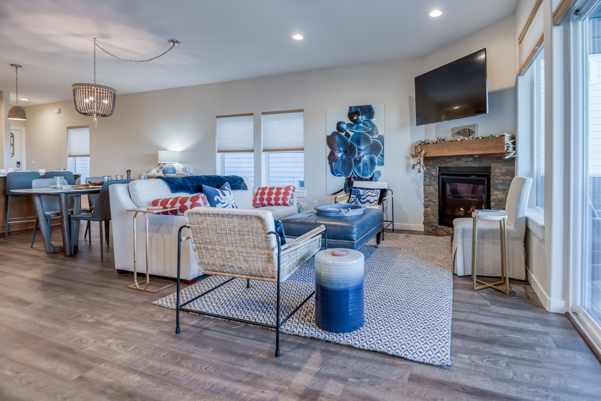 Designed with comfort and relaxation in mind, The Moby House offers a spacious layout that accommodates up to 6 guests. The main living area is located on the second floor, where you’ll find an open-plan space with expansive windows showcasing the views of the ocean. The thoughtfully designed living area is perfect for both entertaining and relaxing, with plush seating, a cozy gas fireplace, and smart home features including two Smart TVs for streaming entertainment.