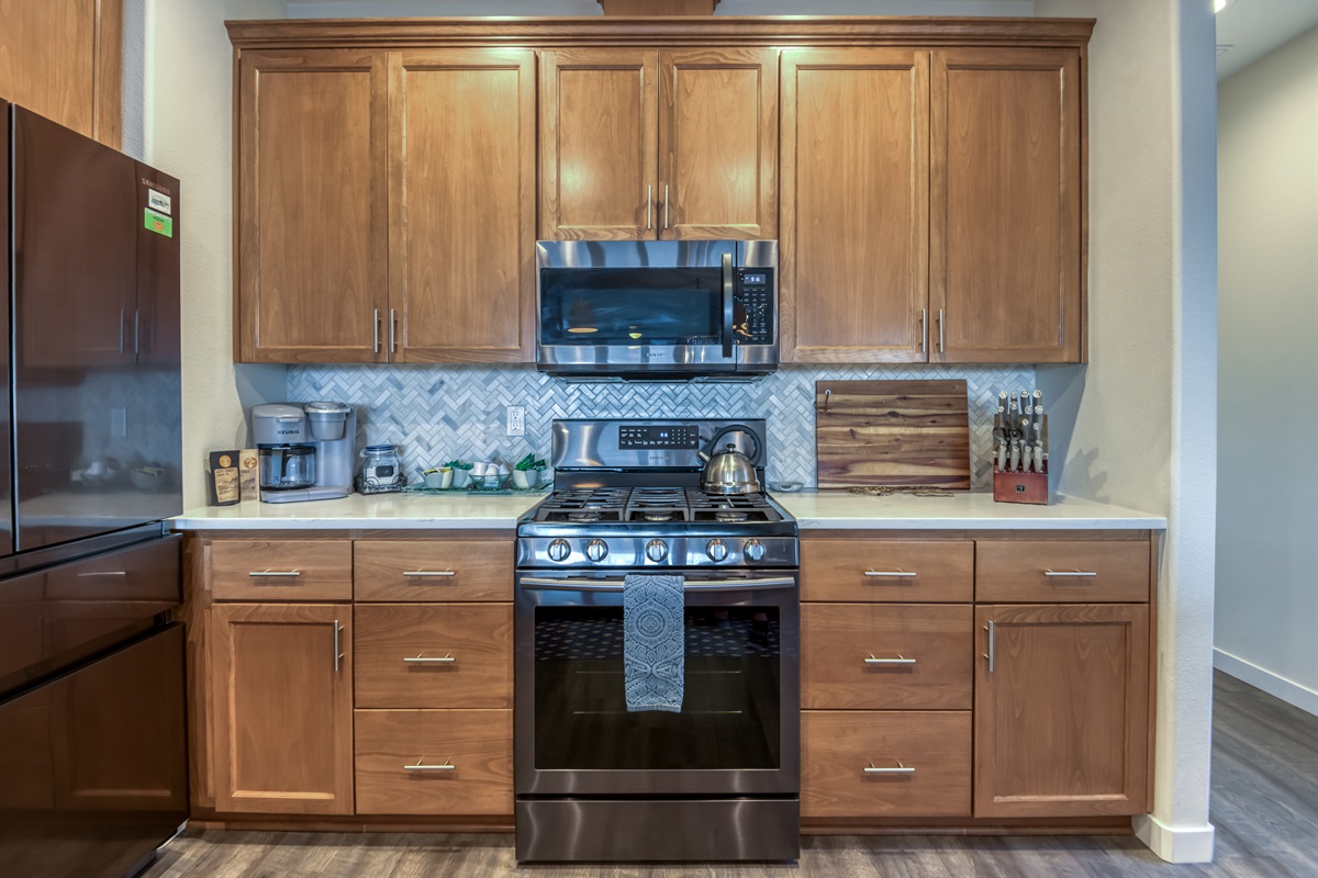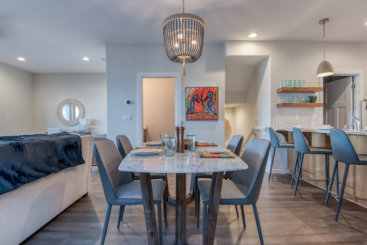 The fully equipped kitchen is a culinary haven, with modern stainless steel appliances, a breakfast bar, and all the essentials for preparing your meals. Whether you're cooking a gourmet dinner or making a quick snack, you'll find everything you need right at your fingertips. The dining table, illuminated by a stunning chandelier, provides a cozy setting for family meals or evening get-togethers.