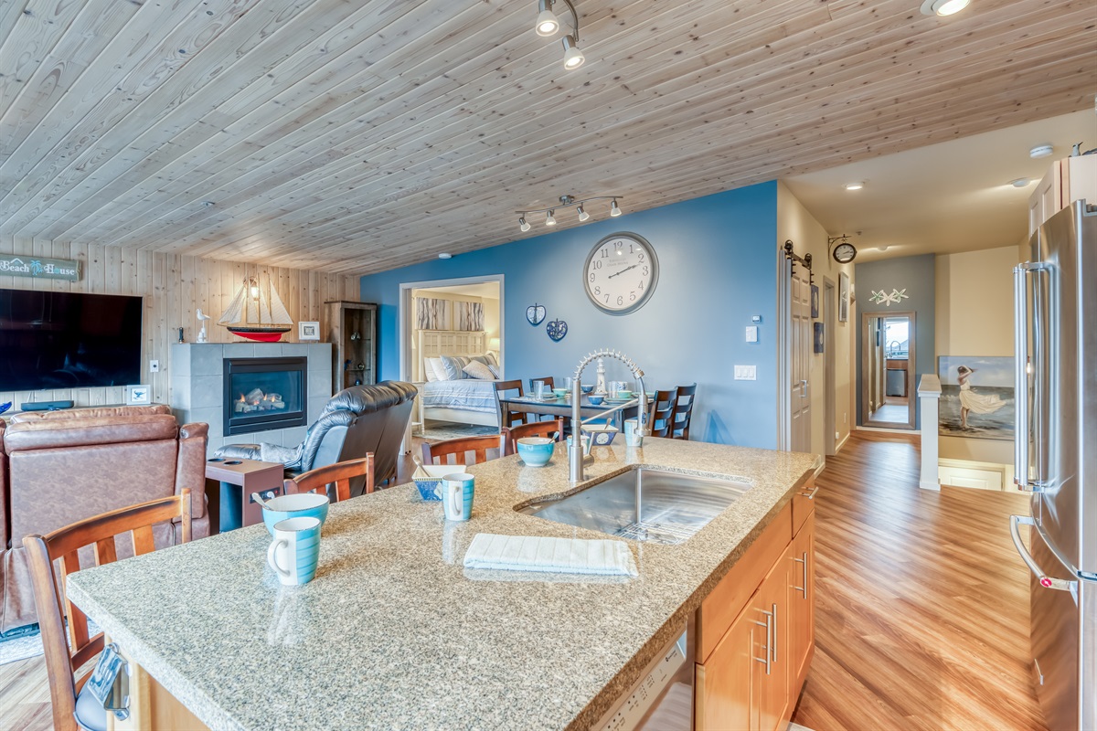 After your outdoor adventures, retreat to the warmth and comfort of the condo, which features hardwood floors, elegant wood ceilings, and cozy leather recliners perfect for unwinding after a day of exploration. The gas fireplace adds to the inviting atmosphere, while the TV provides entertainment for your downtime. For dining, enjoy an elevated dining table in the main living space or head out to the bistro table on the balcony to enjoy meals while taking in the view.