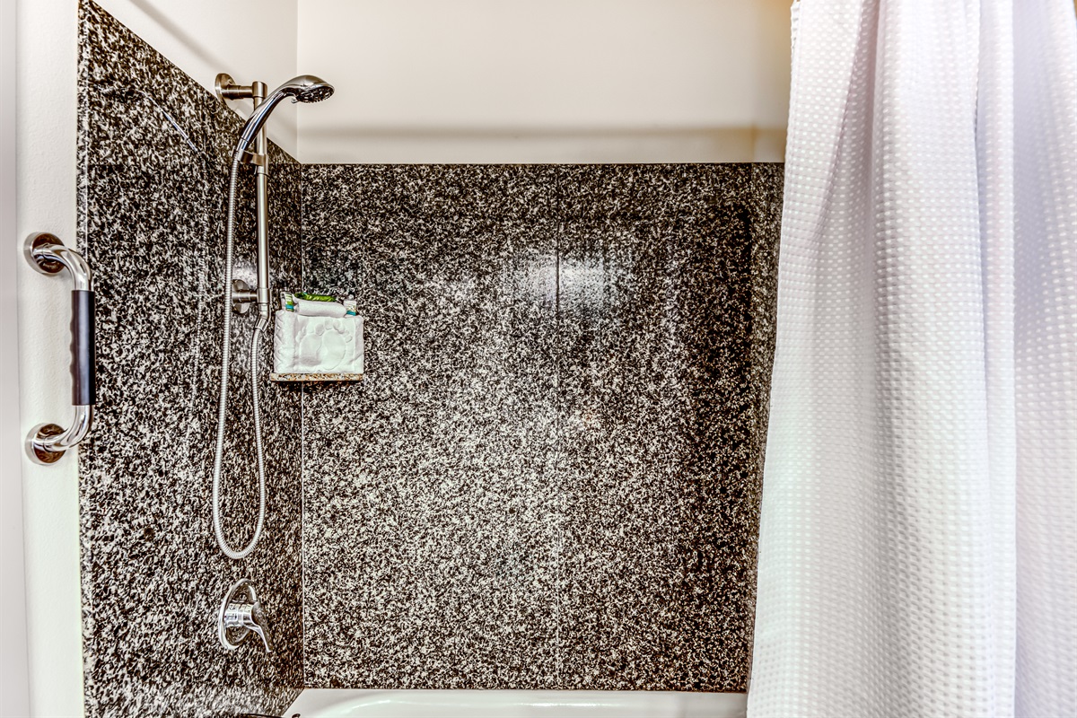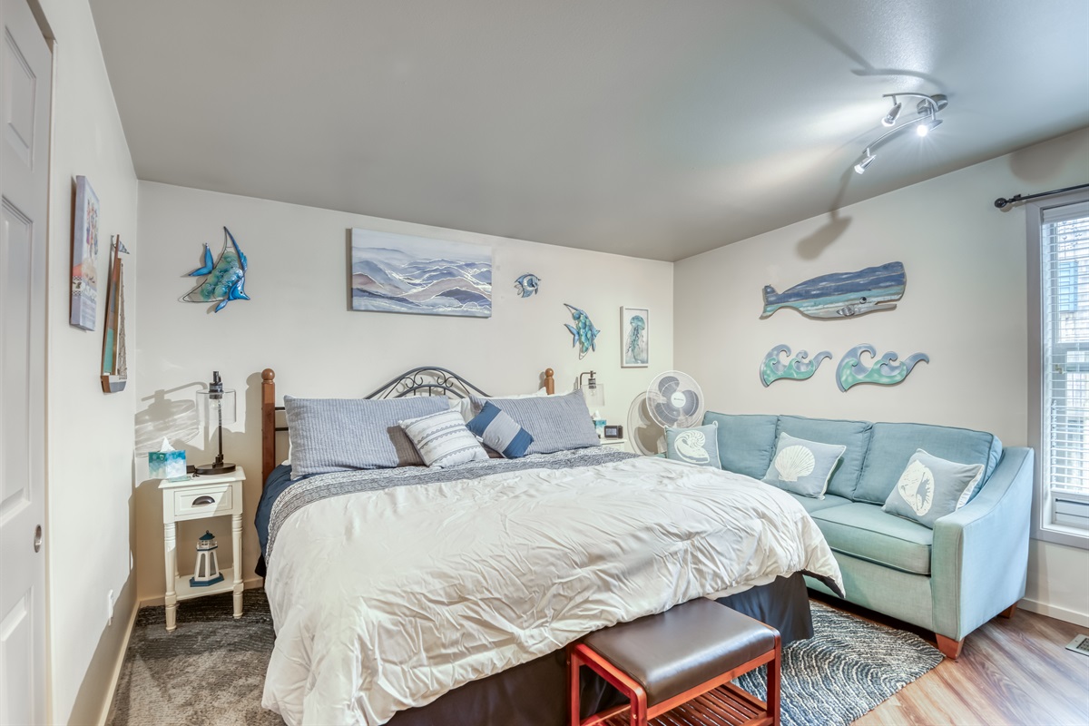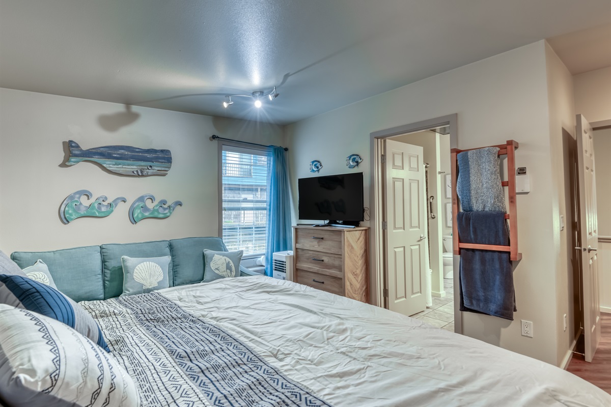 When it’s time to rest, retreat to one of the two sumptuous bedrooms. The first bedroom boasts a queen bed, TV, and an adjacent bathroom with a shower. The second bedroom features a king bed, a comfortable sofa, and an ensuite full bathroom with a tub/shower combo. Each bedroom provides ultimate comfort and privacy, making this the ideal space for a small family or two couples.