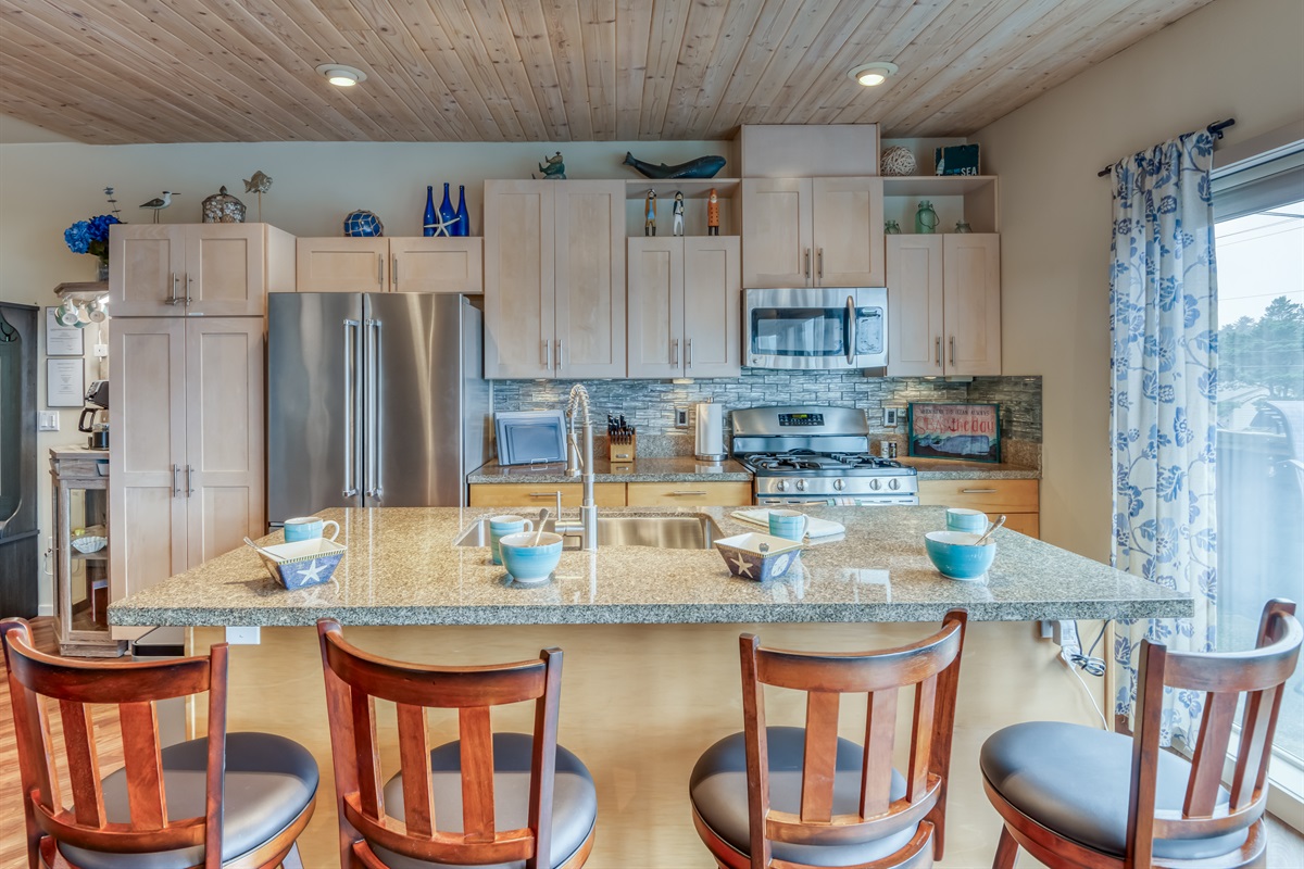 The well-equipped kitchen is a dream for anyone who loves to cook. With sleek quartz countertops, a breakfast bar for four, a gas range, stainless-steel appliances, custom cabinetry, and even a coffee bar, preparing meals is a true pleasure.