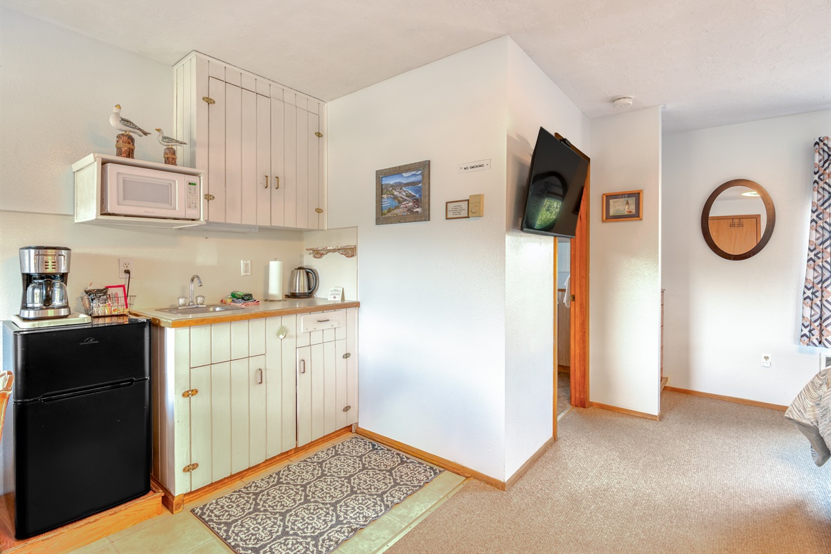 Studio • 1 Bathroom 1 Bath • Sleeps 2-4Experience the quiet beauty of Depoe Bay at this suite at Trollers Lodge! The Beacon is a studio unit with a kitchenette (no cooktop/oven) that has a microwave, mini refrigerator, Coffee maker and a toaster. The unit also has a flat screen TV with cable, and a small desk area for those that may need to bring along work.