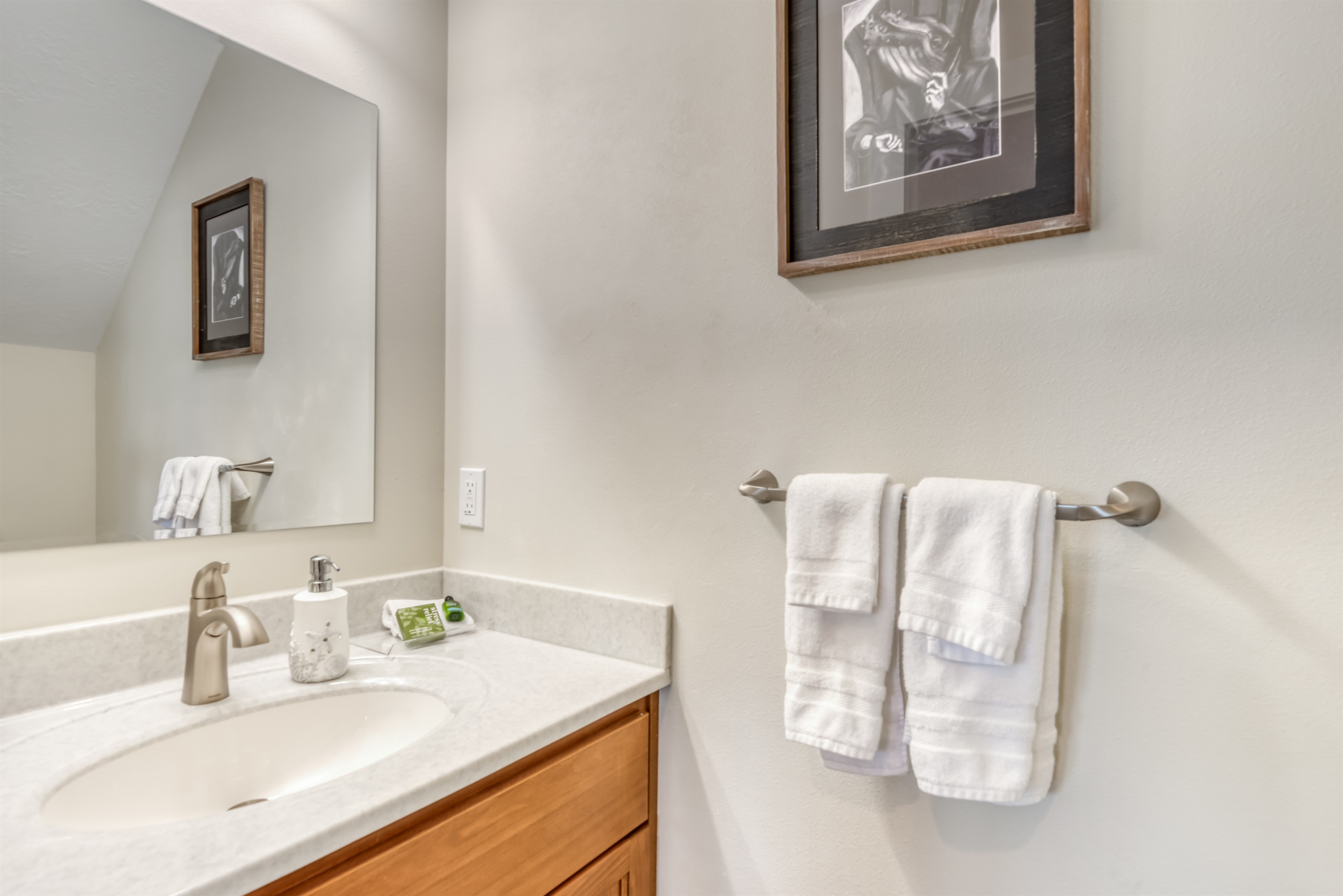 The light-filled, main-level great room includes a bumped-out dining room for views in all directions, a gorgeous modern kitchen with quartz counters, stainless steel appliances and a gas range, and an inlaid, stacked-rock gas fireplace and TV in the living room. Upstairs, three spacious bedrooms, including a master suite on the third floor, will delight your guests.